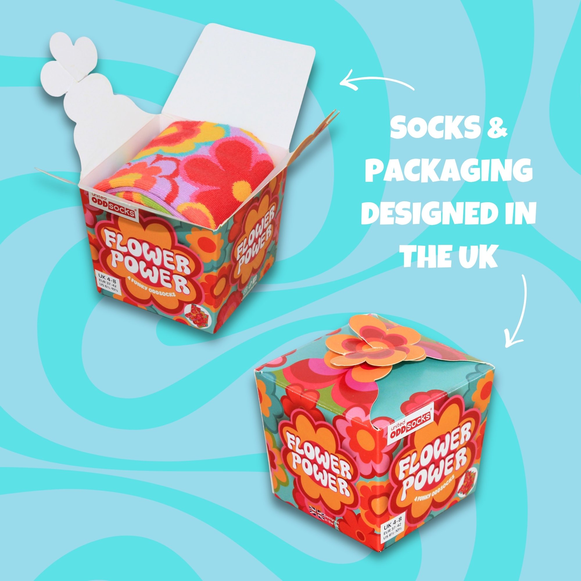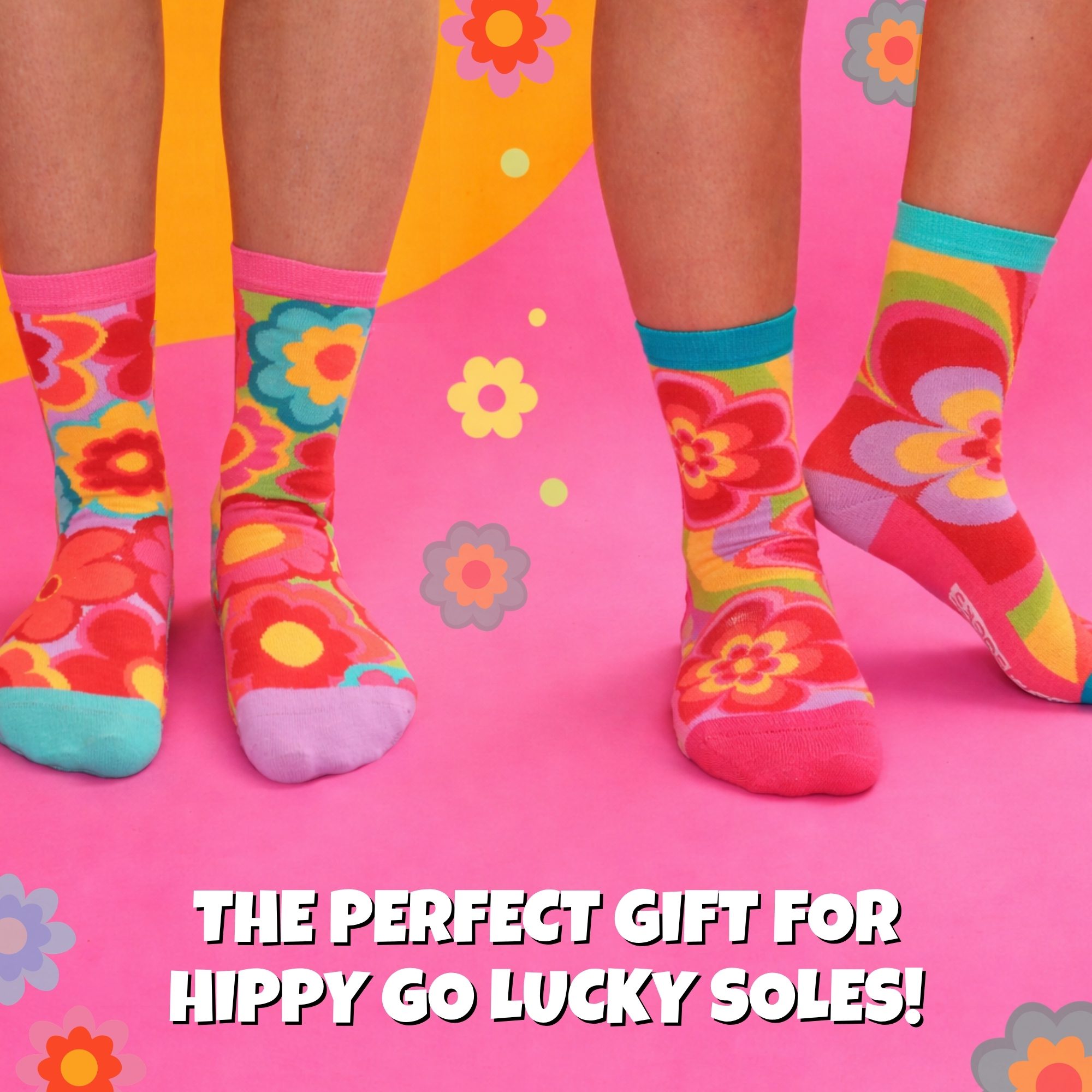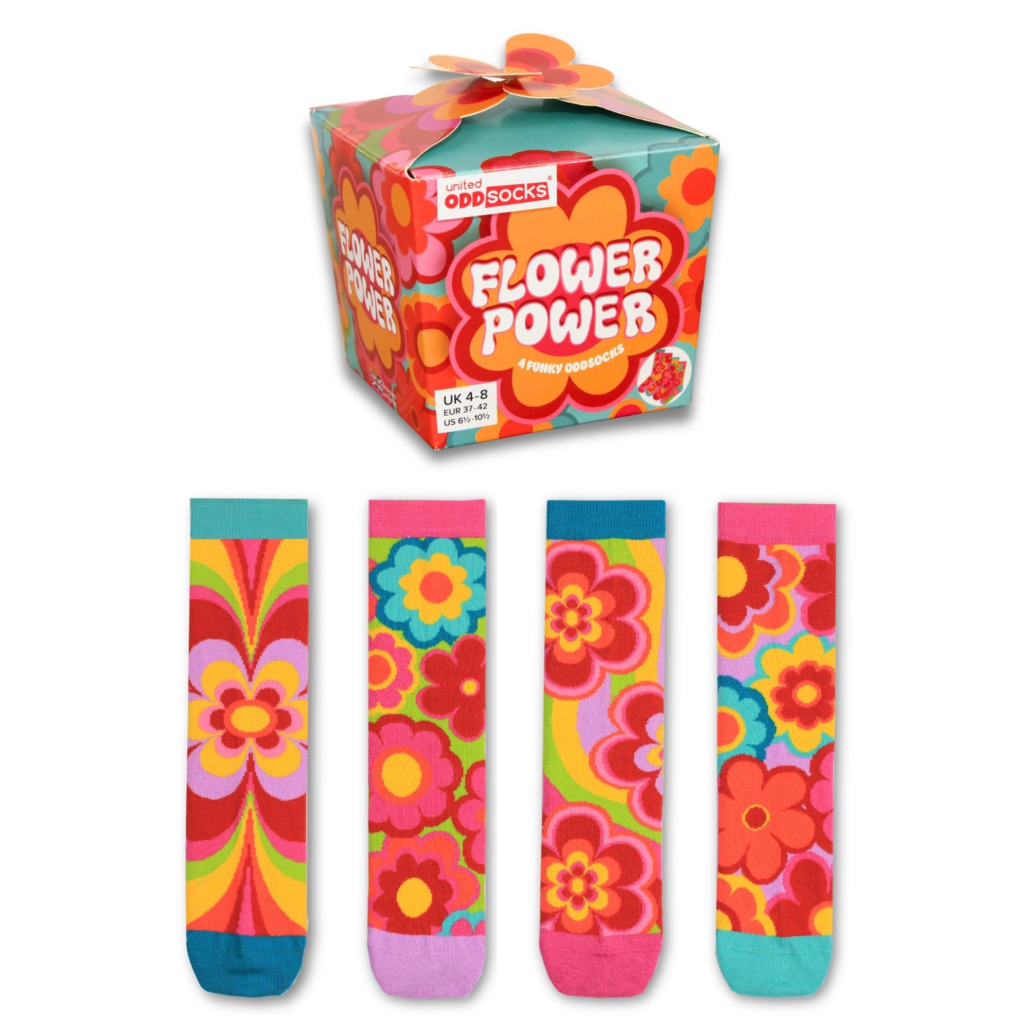 Step into retro bliss with these groovy floral Oddsocks. Bold petals, vibrant colours and feel-good 60s energy bloom with every mix and mismatch. Perfect for free spirits, flower lovers and anyone ready to brighten their day the funky way. Peace, love and lovely toes.