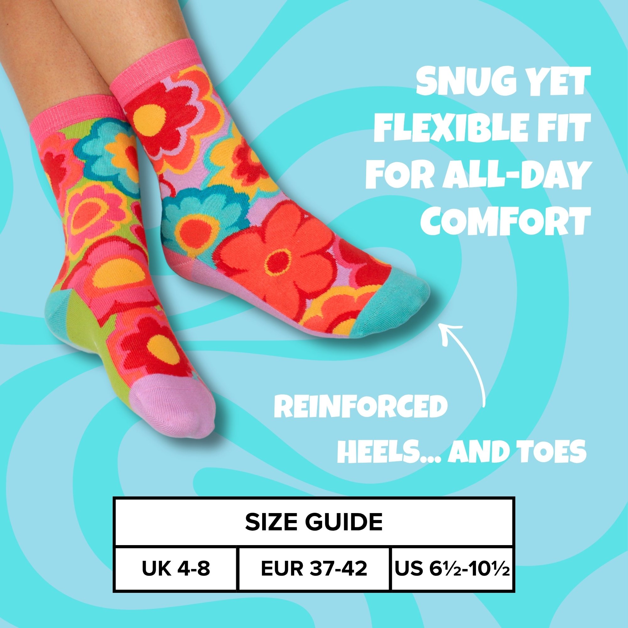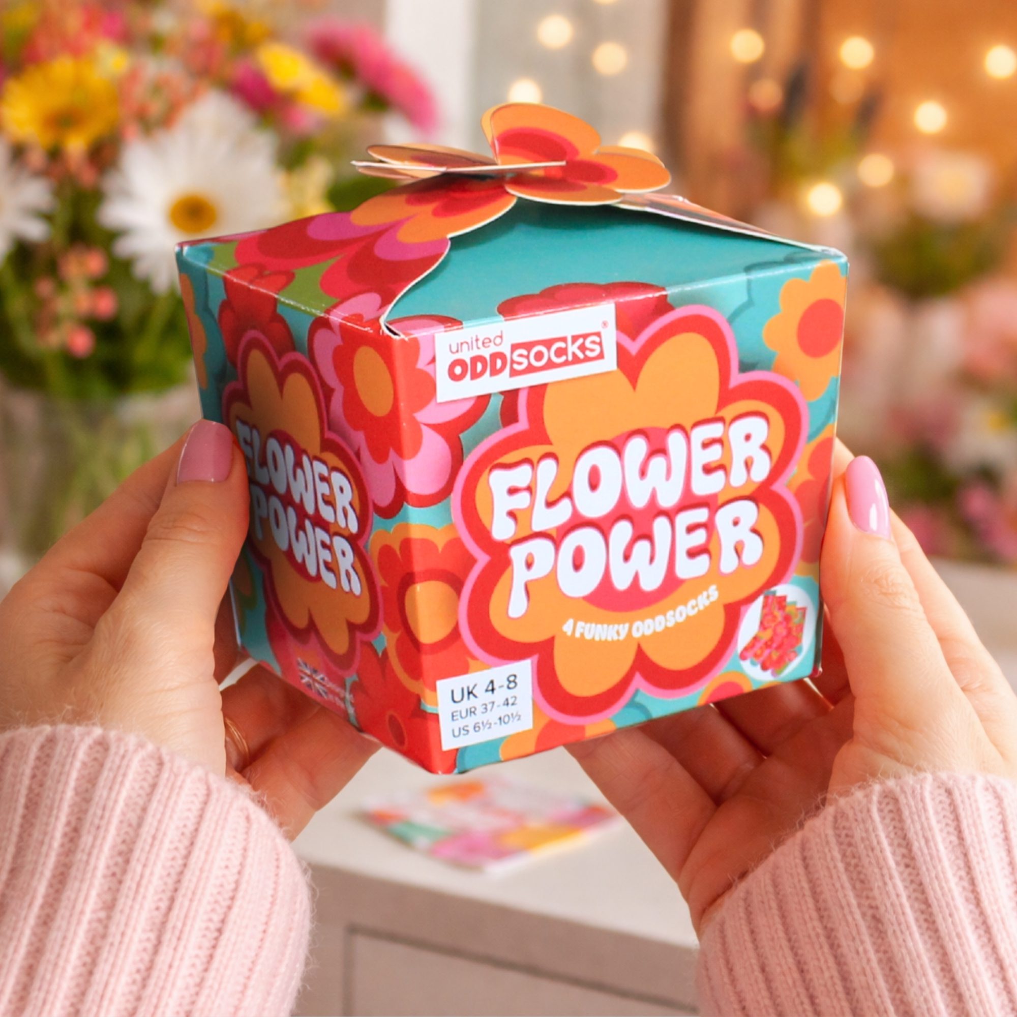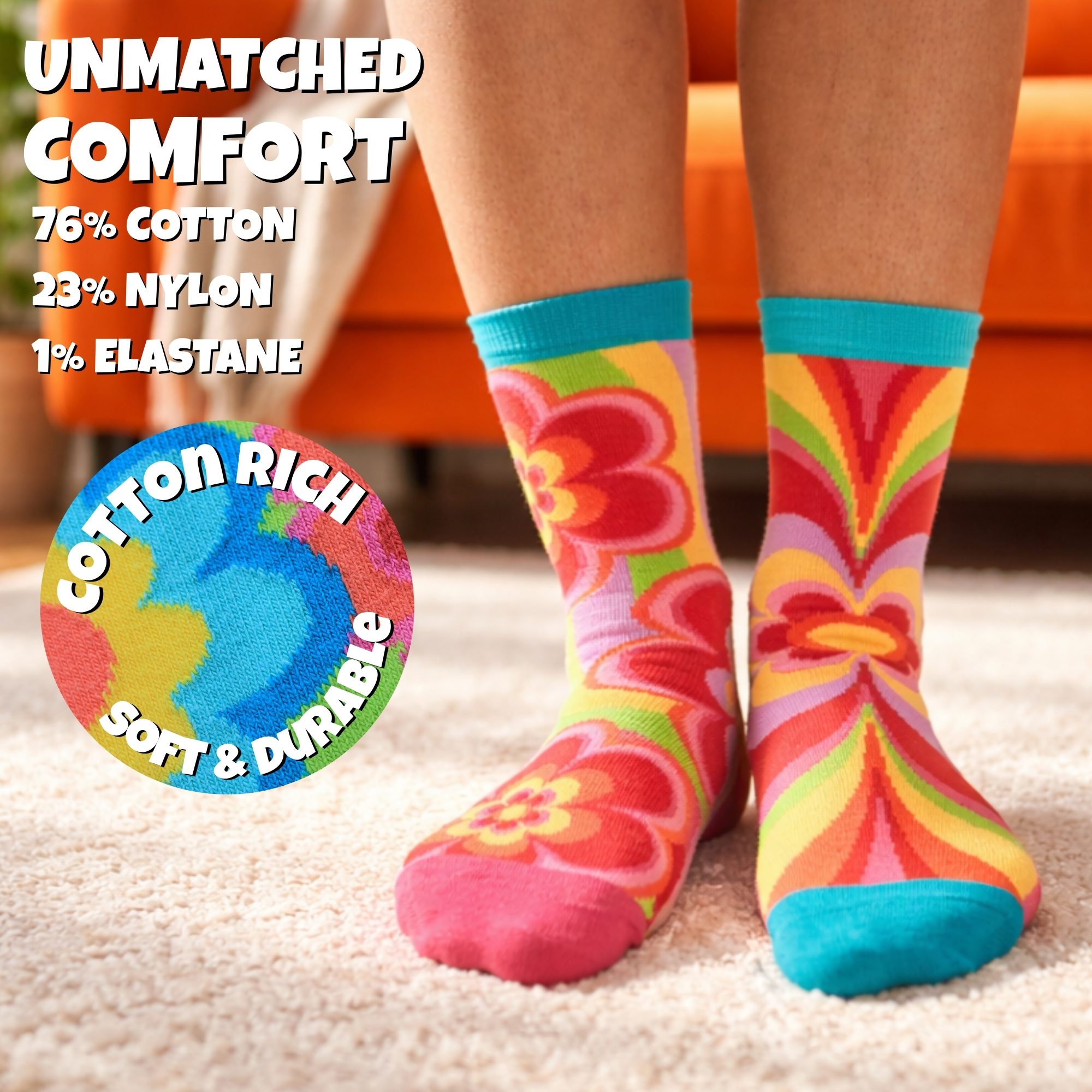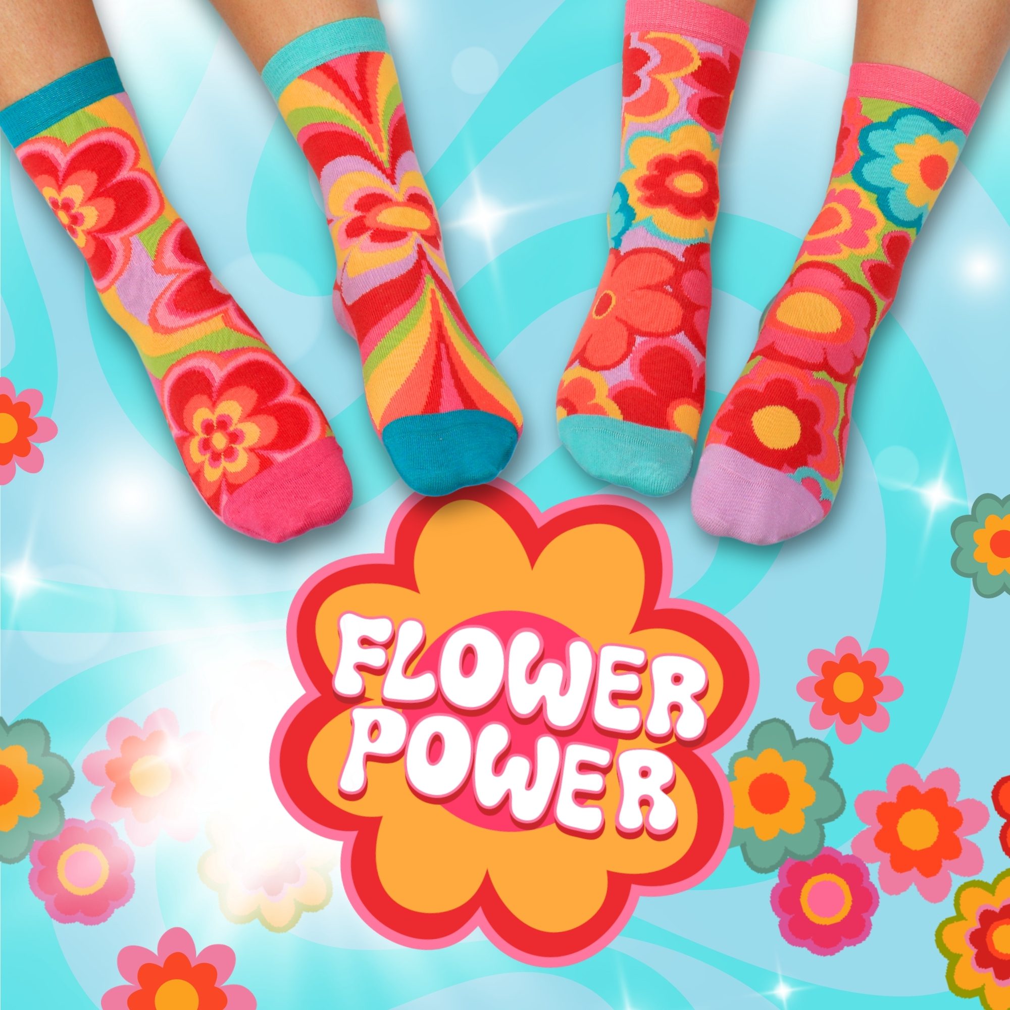 Step into retro bliss with these groovy floral Oddsocks. Bold petals, vibrant colours and feel-good 60s energy bloom with every mix and mismatch. Perfect for free spirits, flower lovers and anyone ready to brighten their day the funky way. Peace, love and lovely toes.